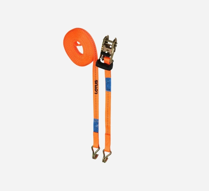The LOTUS 5-TON RATCHET TIE DOWN (LTSX50-10RT) is a professional-grade cargo lashing system designed for maximum security during transport. Measuring 10 meters in length and 50 mm in width, this heavy-duty strap is built from high-tenacity polyester webbing with stitched reinforcement around the hooks to withstand extreme tension. The robust steel ratchet mechanism allows for precise, mechanical tensioning, providing superior load restraint compared to traditional ropes. Equipped with durable double J-hooks, it is the ideal solution for securing heavy machinery, industrial equipment, and large cargo on trailers or flatbed trucks.
