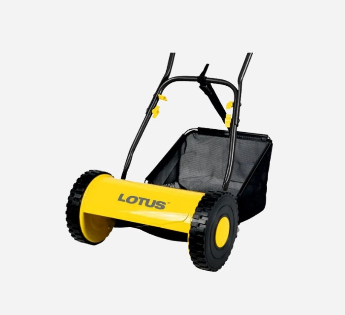 The LOTUS 12-INCH MANUAL PUSH DRIVE LAWN MOWER (LM300X) is an eco-friendly and quiet solution for maintaining small to medium-sized lawns. This cylinder-style mower uses a 5-blade steel reel to slice grass with precision—similar to scissors—rather than tearing it, promoting a healthier and greener lawn. Designed for simplicity, it requires no gas, oil, or electricity, making it virtually maintenance-free. With its lightweight frame, enlarged wheels for better mobility, and an integrated grass catcher, the LM300X offers an effortless mowing experience without the noise or fumes of a traditional engine.