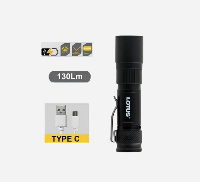 The LOTUS RECHARGEABLE TORCH (LE130RT) is an ultra-compact, high-performance flashlight designed for everyday carry and professional inspections. This versatile tool features a powerful 130-lumen LED main beam for long-distance spotting and a secondary 100-lumen COB side light for wide-area illumination. It is equipped with advanced power technology, boasting a Super Fast 40-minute charging time via its integrated USB-C port. Its lightweight, ergonomic build makes it the perfect companion for automotive work, outdoor adventures, or emergency home kits.