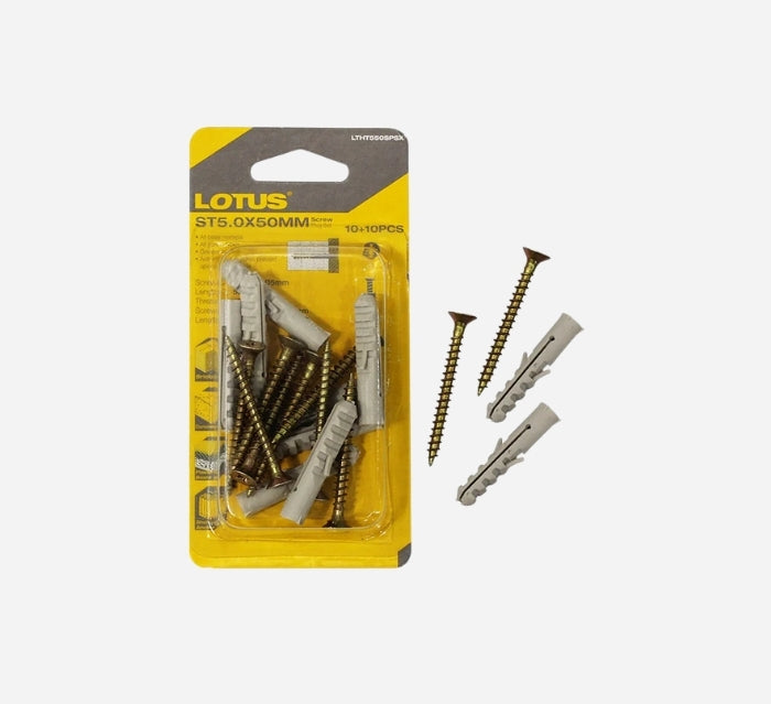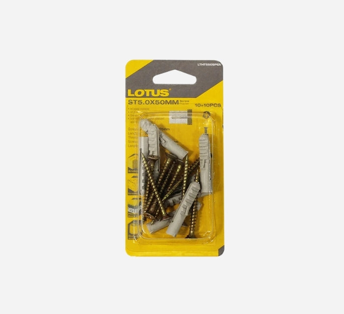 The LOTUS SCREW PLUG SET (LTHT550SPSX) is a reliable, high-quality anchoring solution designed for secure fastening in masonry, concrete, and solid brick. This set features durable ST5.0 x 50mm steel screws paired with high-grade plastic expansion plugs. The screws are zinc-coated for enhanced corrosion resistance, while the plugs feature a non-slip wing design to prevent rotation during installation. This kit is an essential for mounting shelves, brackets, electrical fixtures, and various home or industrial hardware where a strong, permanent hold is required.